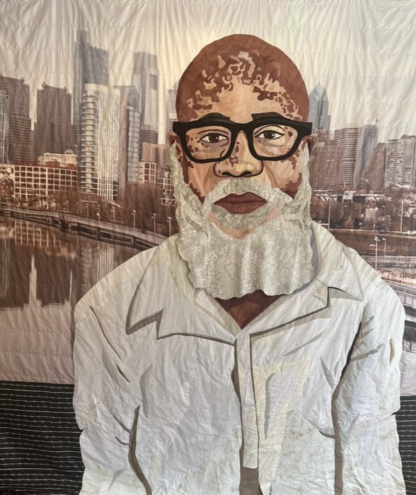Hand sewn art quilt with textile background; 110 inches x 105 inches